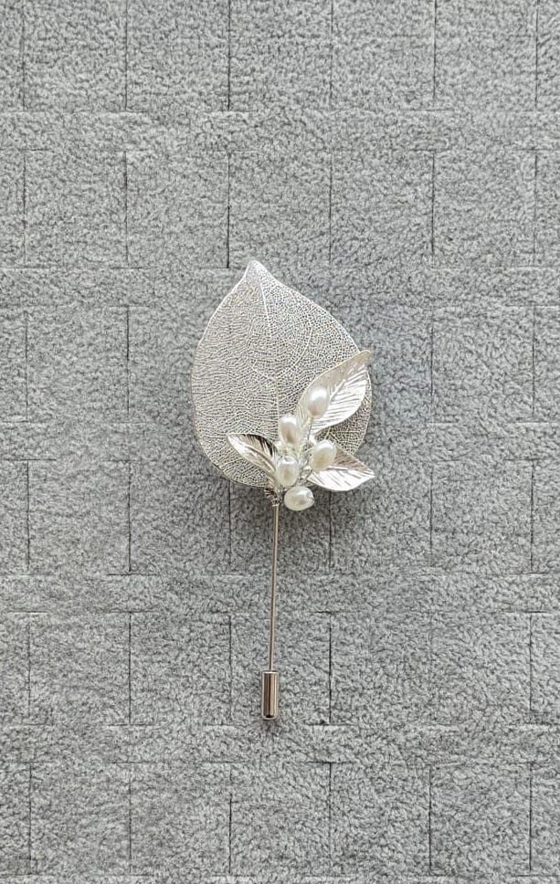 1 Boutonniere de Hoja natural bañada en metal con aplicación de 3H de hojas y perlas de gota.