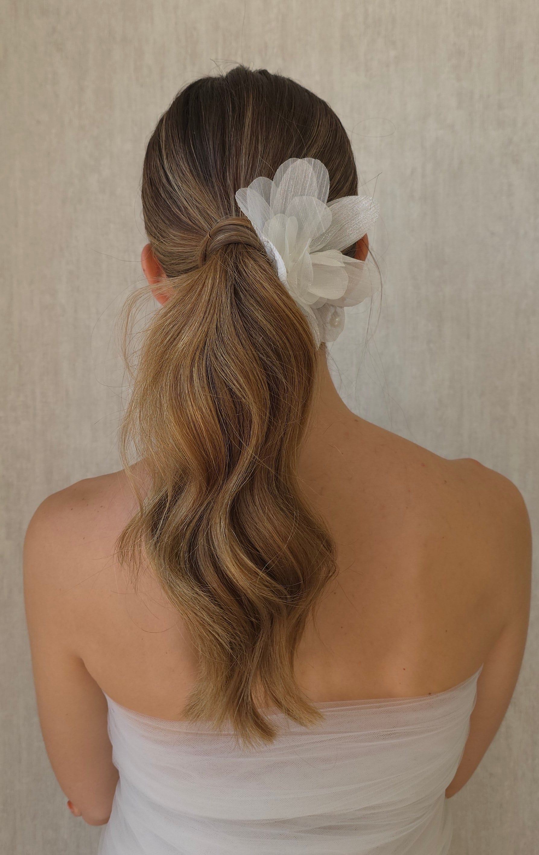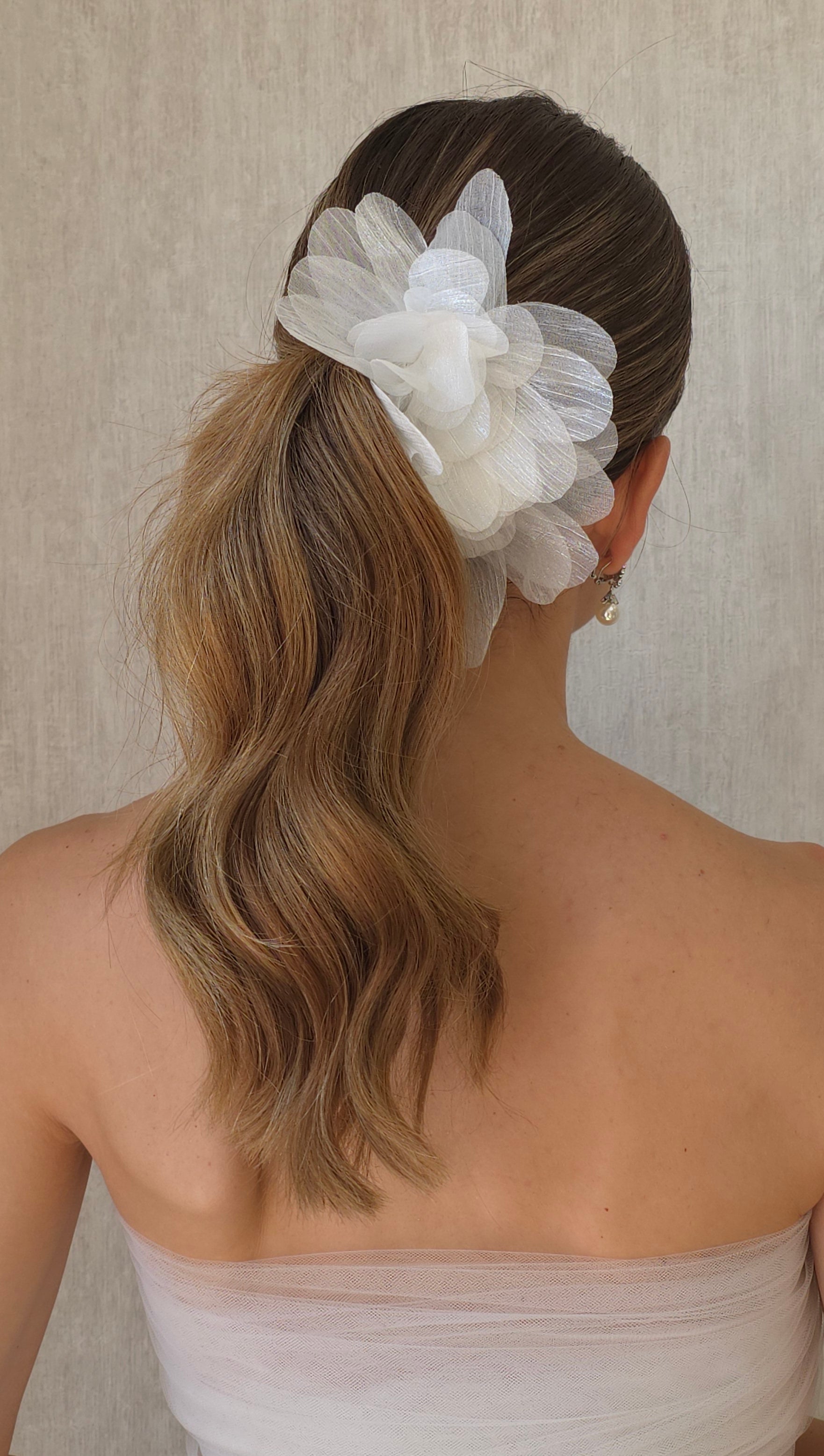 Inspiradas en looks frescos y relajados, diseñamos las flores Talina, hechas con pétalos largos de tela organza en tonos shimmer que atrapan la luz con su movimiento, su color off white hace que estas flores resalten en cualquier color de cabello. Estas Flores son ideales para usar con recogidos altos o bajos, o incluso se pueden acomodar para usarse con semi recogidos!
