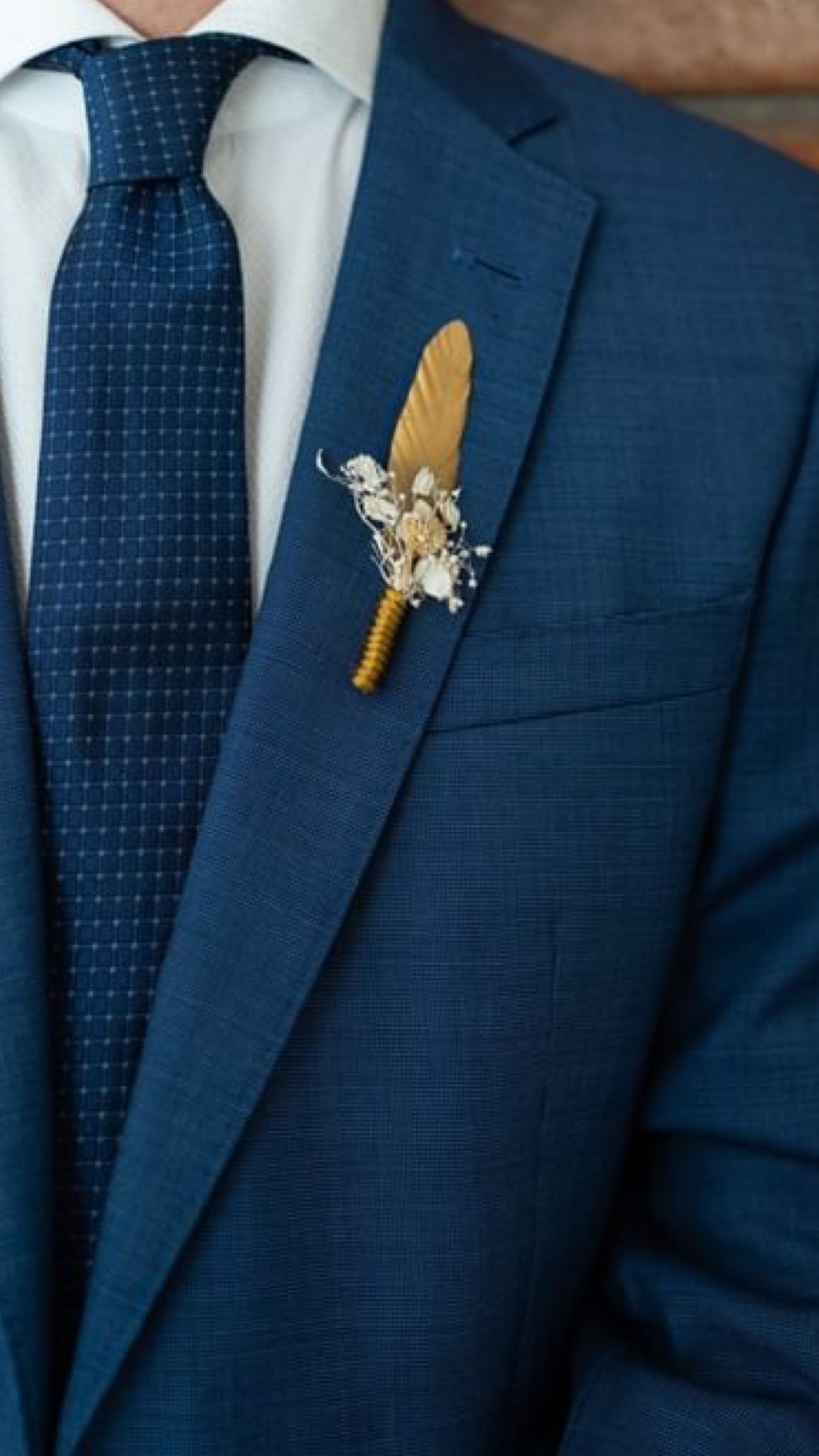 Boutonniere de Pluma Natural en color dorada con flores de naturaleza muerta
