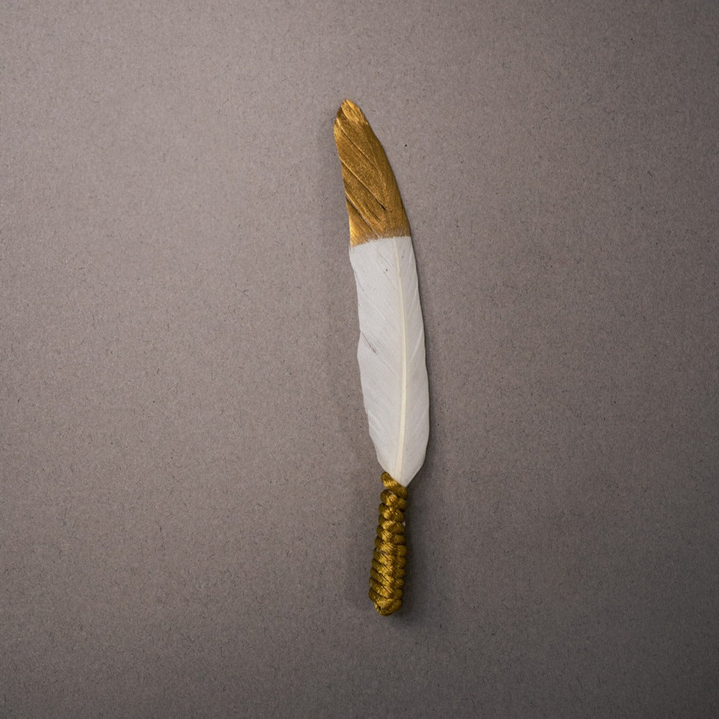 Boutonniere de pluma natural pintada en la punta de color dorado, hecho a mano