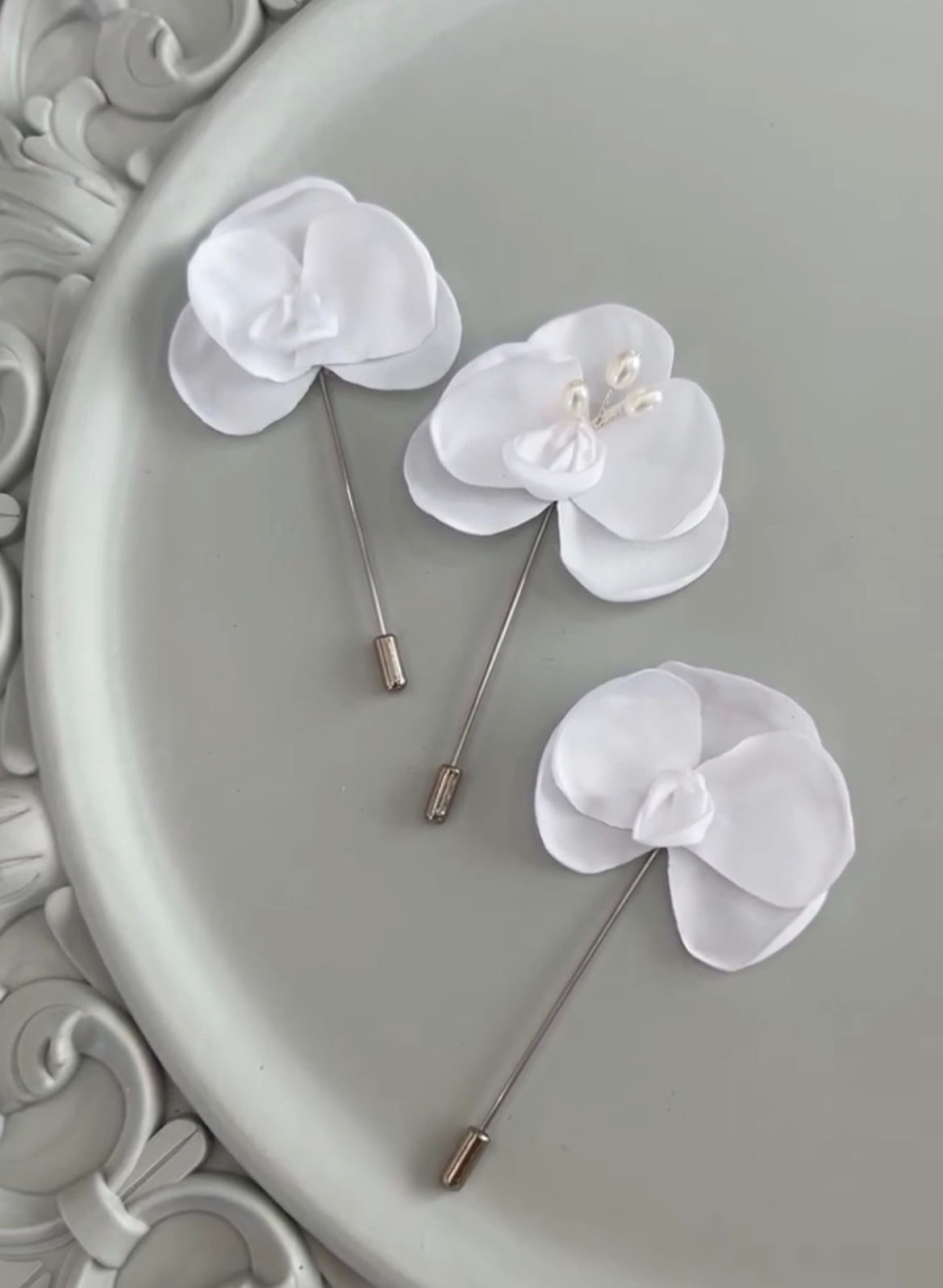 Un Boutonniere de Orquídea de tela con centro de perlas de gota para el novio.