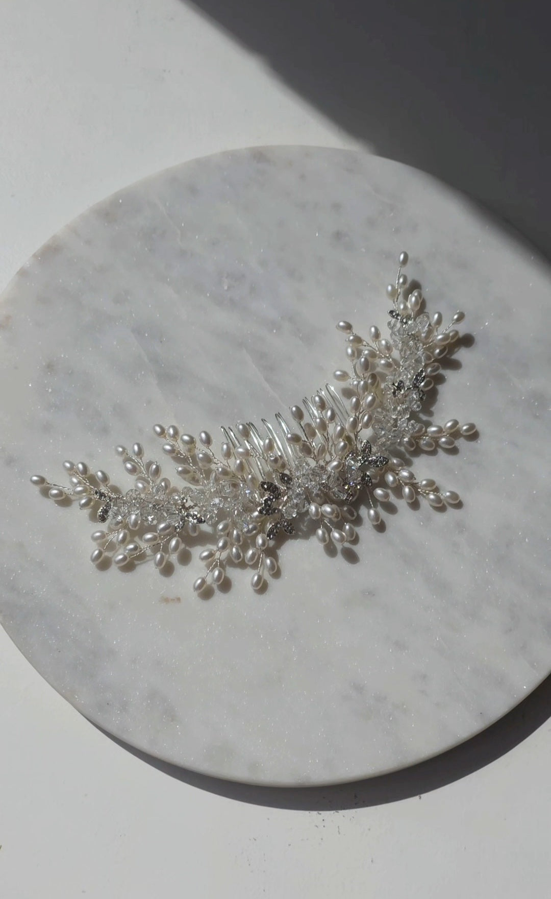 Esta elegante pieza esta inspirada en las novias que buscan un accesorio protagonista, con aplicaciones en tonos plata que combinados con los cristales aportan brillo de forma sutil ..las ramas modeladas a mano llevan ese tono perlado, crea un look final perfecto para cualquier bridal event!